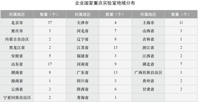 企業(yè)國家重點實驗室分布在全國29個省、自治區(qū)和直轄市,中、東部省區(qū)的企業(yè)國家重點實驗室占80.2%。其中,北京市37個,山東省17個,江蘇省和廣東省各13個,上海市11個。基本反映了企業(yè)研發(fā)能力的總體布局。