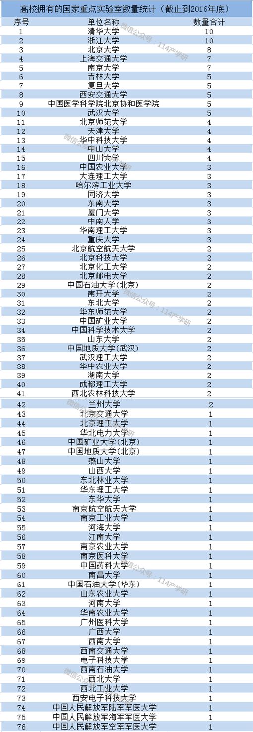 下面看看各高校國家重點實驗室的數(shù)量統(tǒng)計(數(shù)據(jù)來源于科技部發(fā)布的報告;共建的國家重點實驗室按各共建單位各有一個進(jìn)行統(tǒng)計;科技部發(fā)布的報告中國家重點實驗室不包括省部共建國家重點實驗室和企業(yè)國家重點實驗室;統(tǒng)計數(shù)據(jù)時未去掉2017年評估未通過的國家重點實驗室名單,數(shù)據(jù)統(tǒng)計于青塔):